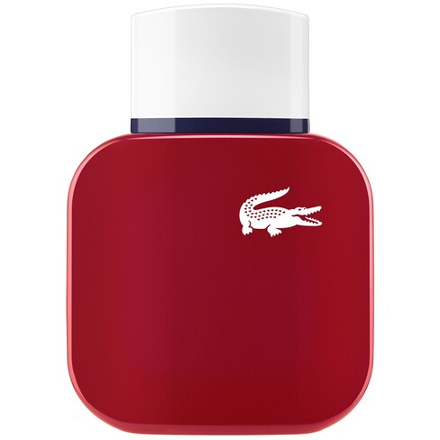 The Lacoste L.12.12 French Panache Eau de Toilette fragrance is presented in a red bottle with contemporary lines, decorated with the brand's iconic crocodile.